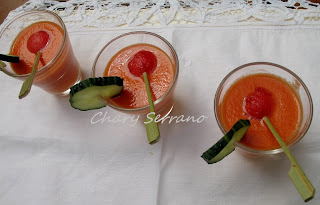 Este gazpacho es uno de los clásicos del verano. Tanto en el aperitivo como de entrante es una buena alternativa. Yo lo he presentado en vasitos, pero otras veces lo tomamos tipo sopa fría. Hay variadas recetas del mismo que incluyen cebolla, pepino, pan, pero yo prefiero hacerlo así de sencillo, porque considero que mientras mas ingredientes tenga se enmascara mas el gusto de la sandía. No le echo pan porque eso conllevaría echarle agua y vuelvo a lo mismo: cambia el sabor y además le agregamos calorías inútiles. Con el líquido que aportan el tomate y la sandía es mas que suficiente para que tenga un cierto grado de espesor y lo hace tremendamente nutritivo y bajo en calorías, cosa importante. Si lo hacéis, comprobaréis el extraordinario sabor y ese punto agri-dulce que lo hace diferente.