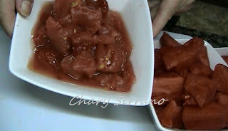 400 g.de sandía sin la cáscara (aproximadamente un cuarto de una sandía mediana) 2 tomates maduros, bien rojos 1/2 pimiento de asar rojo 1 diente de ajo pequeño ( o medio) 100 cc. de aceite de oliva virgen extra 1 cucharada de vinagre de vino tinto (se pueden utilizar otros vinagres) Sal -- Quitar la cáscara de la sandía, trocear y quitar las pipas. Pelar los tomates y trocearlos. Limpiar el pimiento y trocearlo. Pelar el ajo y quitarle la venita central. Comenzamos quitándole la cáscara a la sandía, eliminando toda la parte blanca. Troceamos y le quitamos las pipas. En este caso tiene algunas blancas pequeñitas y no importa dejárselas, pues se trituran muy bien en la batidora y no dan mal sabor. Sacamos bolas de la sandía para después usarlas en la presentación y las metemos en el frigorífico.
